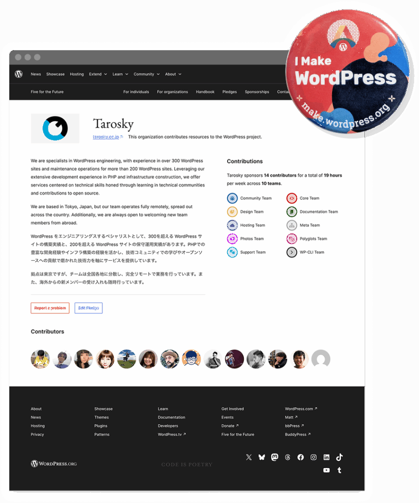 私たちはWordPressのコントリビューターです。Five for the Futureへの参加、WordPressコアの開発、WordPressプラグインの開発、WordPressコアやプラグインの翻訳、WordPressのWebサイト(wordpress.org)のサポートフォーラムでの回答、WordCampのオーガナイザー、WordCampのスピーカーなどの活動を行っています。